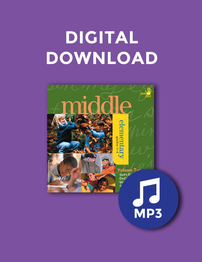 Music for one full year of Middle Elementary Year 2 curriculum. MP3 download contains 14 biblically sound songs designed with your children in mind—simple tunes they will enjoy, words they can understand, and lasting words of Scripture to encourage their hearts. Use with family devotions, at home, and with the Middle Elementary curriculum. No returns on digital products.