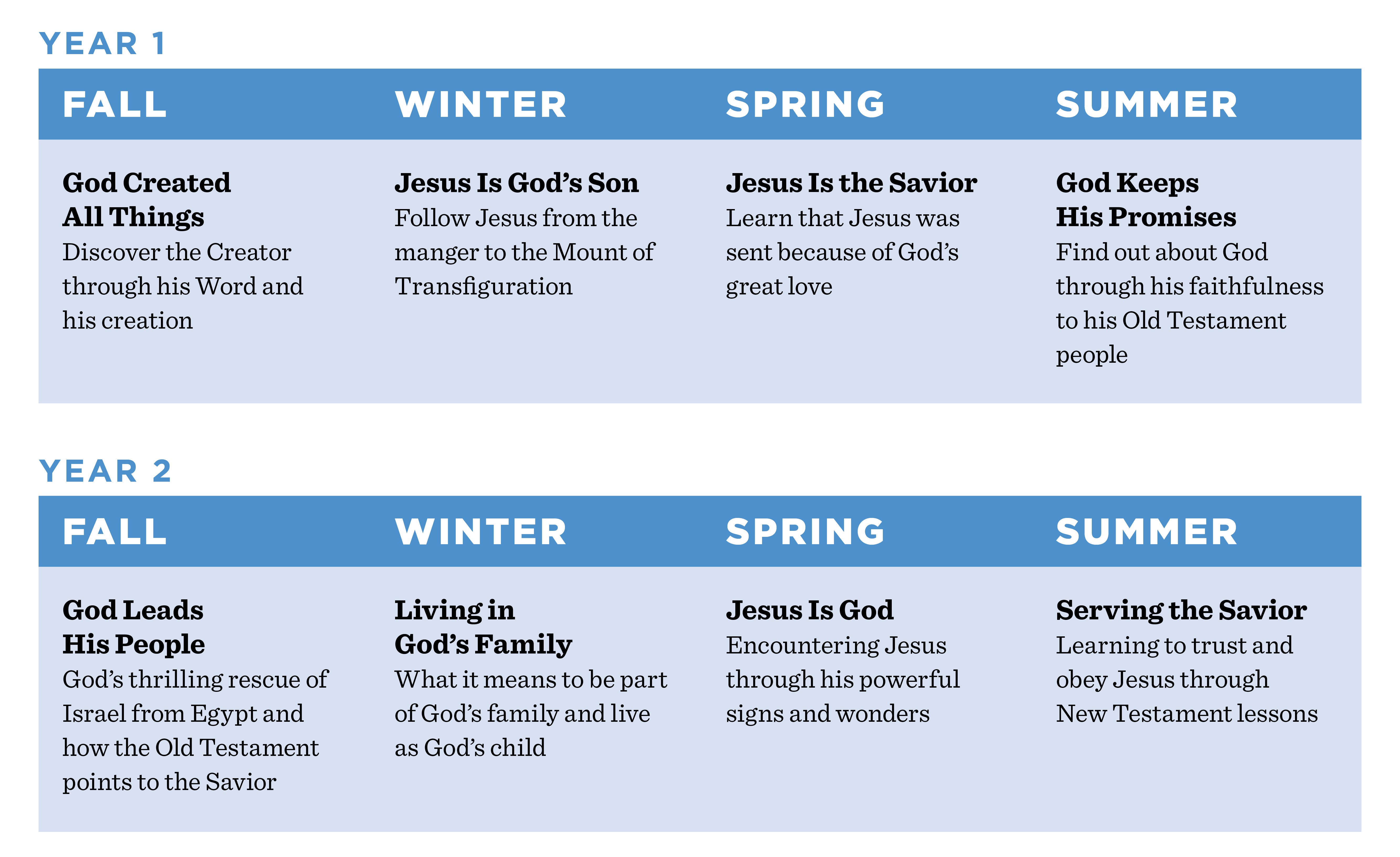 To teach preschoolers the Bible, we start with something familiar and real to them and connect it to a new, deeper truth about God and how it applies to their everyday lives. They discover what it means to be part of God’s family and how to live as God’s children. They learn about Creation, the Fall, the promised Savior, God’s faithfulness to his people, and that Jesus was sent because of God’s great love.