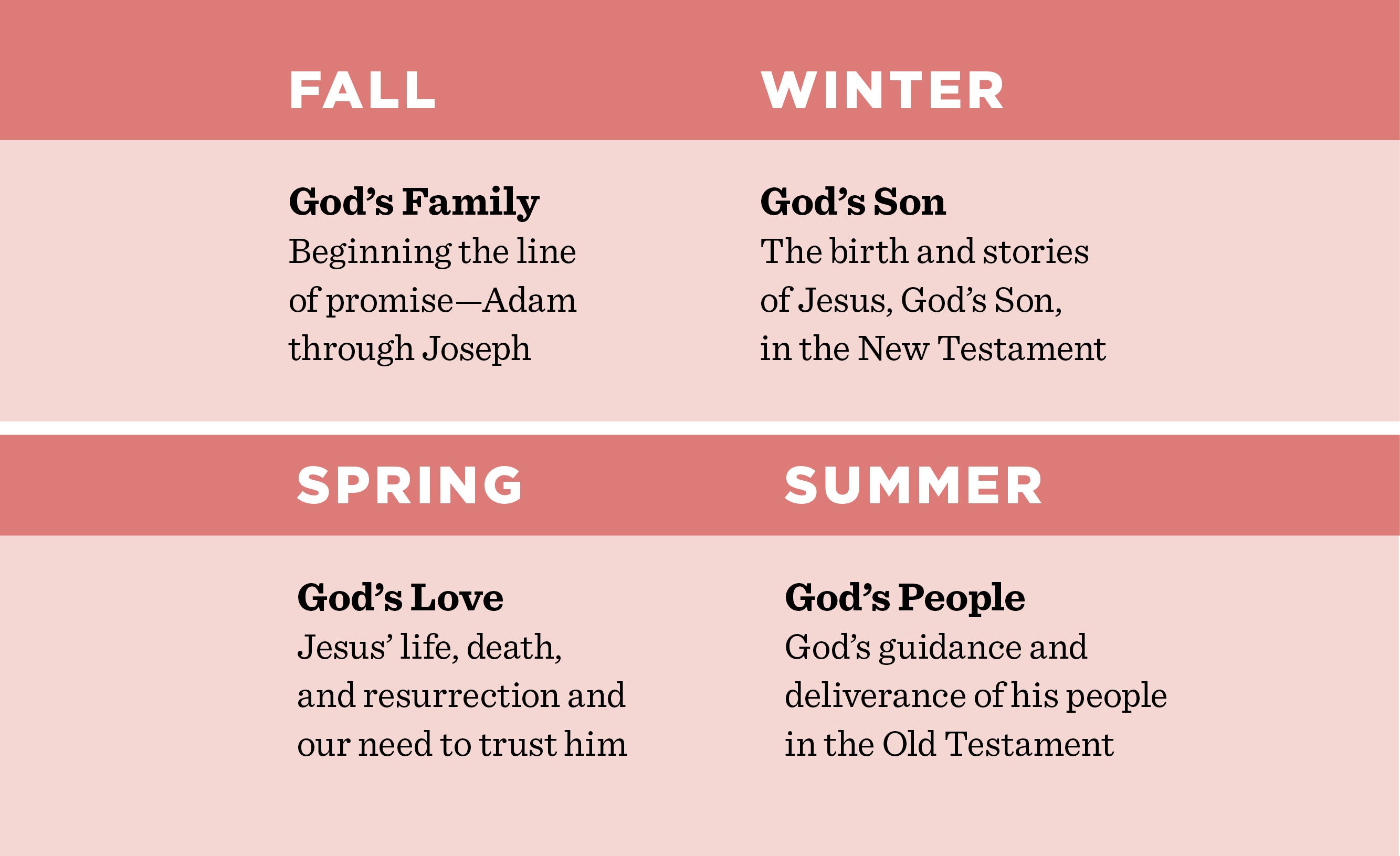 The average vocabulary of a two-year-old is 200 words. This grows into an astounding 1,500 words or more during the third year! What an exciting opportunity to teach redemptive, historical Bible truths to 2-year-olds who are learning the words of faith and 3-year-olds who are learning the stories of faith.
